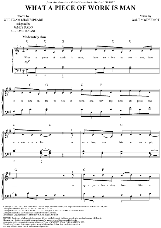 Digital Sheet Music for What a Piece of Work is Man by Galt MacDermot, James Rado, Gerome Ragni, John Lane, William Shakespeare scored for Easy Piano/Vocal; id:251517