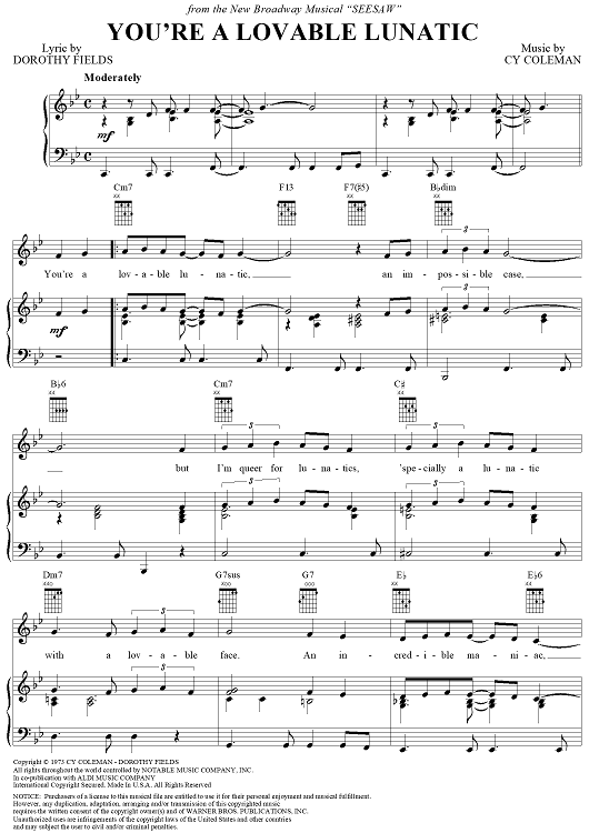 Digital Sheet Music for You're A Lovable Lunatic by Cy Coleman, Dorothy Fields scored for Piano/Vocal/Chords; id:271778