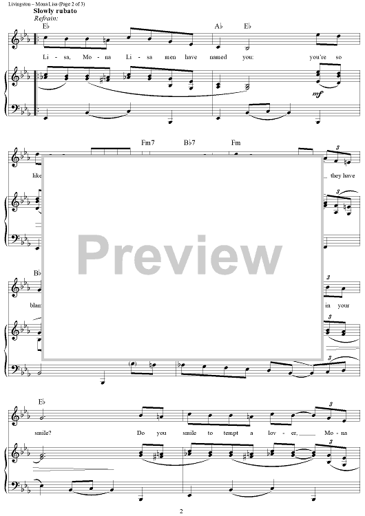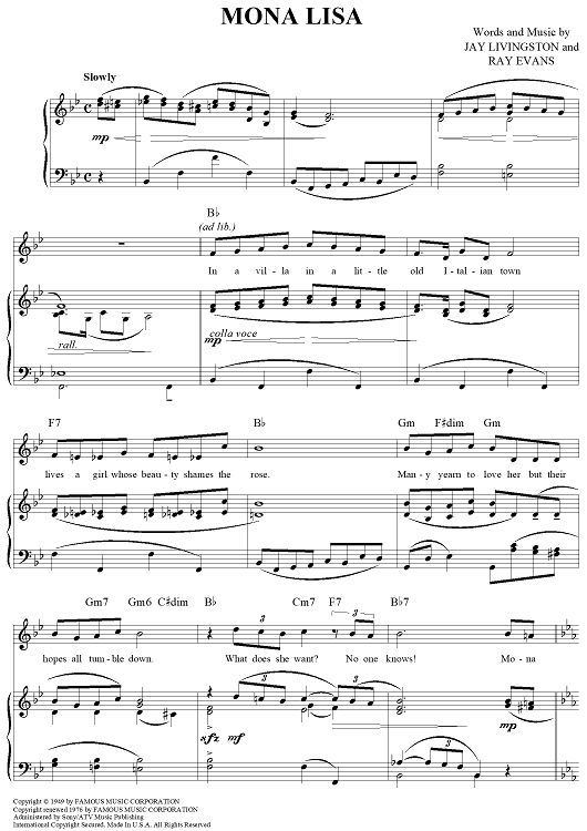 Digital Sheet Music for Mona Lisa by Jay Livingston, Ray Evans, Nat King Cole scored for Piano/Vocal/Chords; id:362596