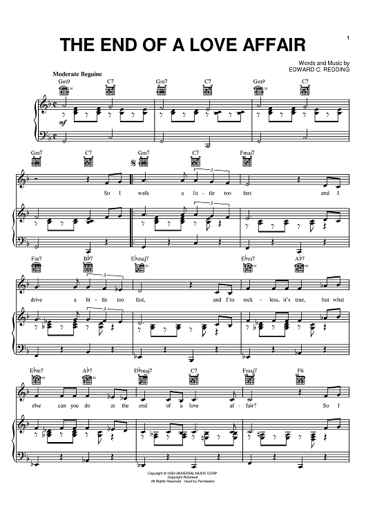 Digital Sheet Music for The End Of A Love Affair by Frank Sinatra, Nat King Cole, Edward C. Redding scored for Piano/Vocal/Chords; id:383211