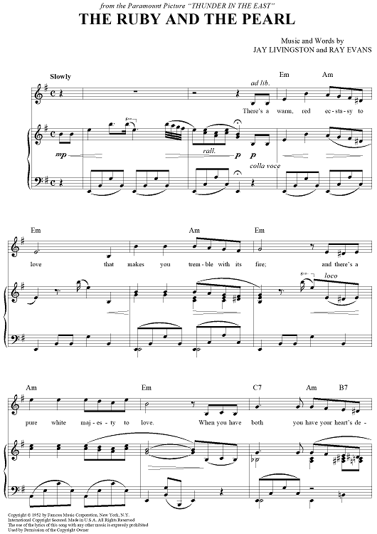 Digital Sheet Music for The Ruby and the Pearl by Jay Livingston, Ray Evans, Nat King Cole scored for Piano/Vocal/Chords; id:365210