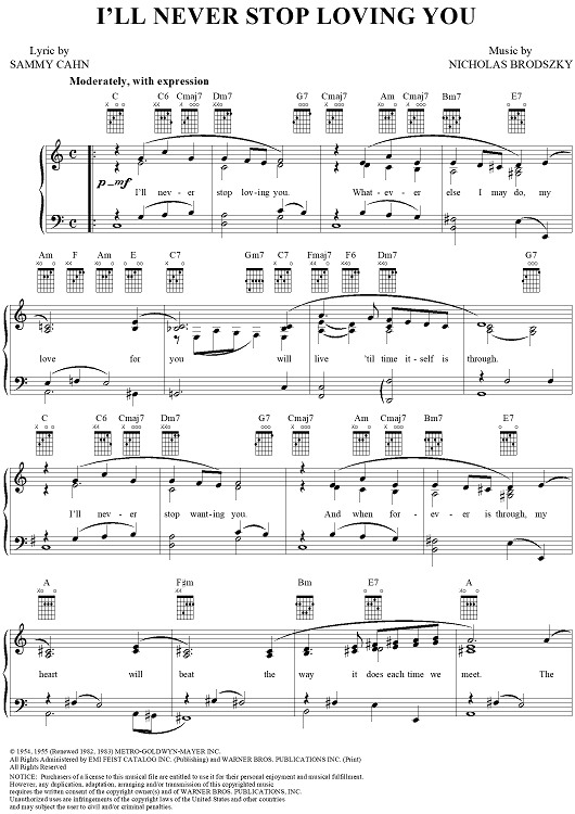 Digital Sheet Music for I'll Never Stop Loving You by Sammy Cahn, Nicholas Brodszky scored for Piano/Vocal/Chords; id:220571