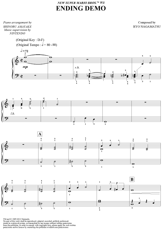 Digital Sheet Music for New Super Mario Bros. Wii™: Ending Demo by Ryo Nagamatsu, Shinobu Amayake scored for Easy Piano; id:448387