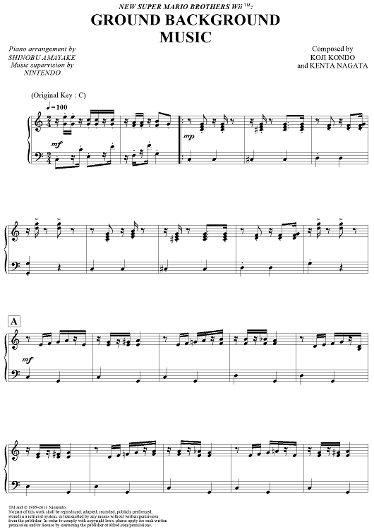 Digital Sheet Music for New Super Mario Bros. Wii™: Ground Background Music by Koji Kondo, Kenta Nagata, Shinobu Amayake scored for Piano Solo; id:445092