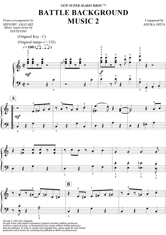 Digital Sheet Music for New Super Mario Bros.™: Battle Background Music 2 by Asuka Ohta, Shinobu Amayake scored for Easy Piano; id:447075