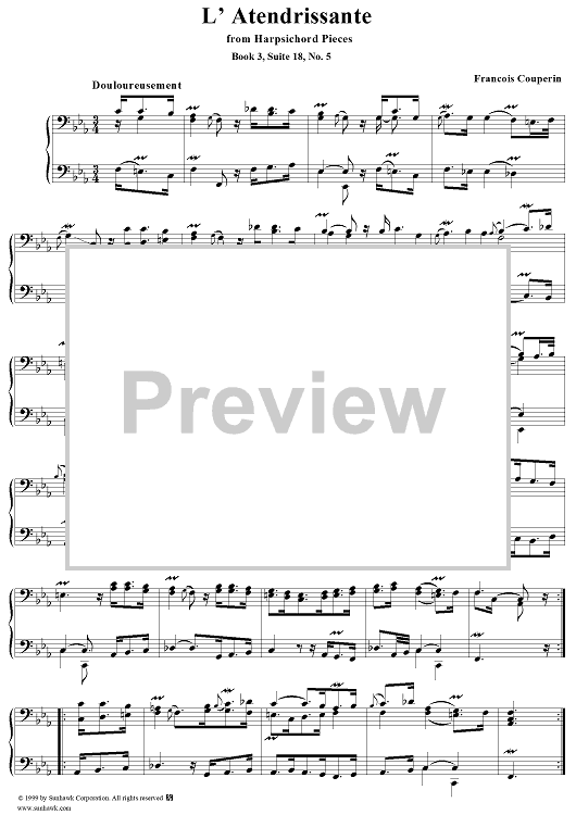 Digital Sheet Music for Harpsichord Pieces, Book 3, Suite 18, No. 5: L'Atendrissante by Francois Couperin scored for Piano Solo; id:272535