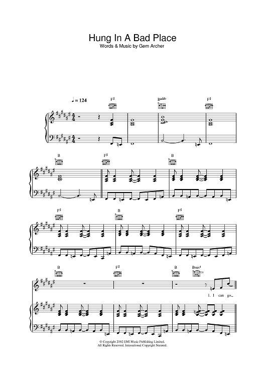 Digital Sheet Music for Hung In A Bad Place by Oasis, Gem Archer scored for Piano/Vocal/Chords; id:385859