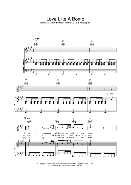 Digital Sheet Music for Love Like A Bomb by Oasis, Gem Archer, Liam Gallagher scored for Piano/Vocal/Chords; id:387468