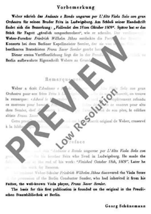 Weber wrote Andante e Rondo ungarese per l'Alto Viola Solo with Gran Orchestra for his brother Fritz in Ludwigsburg. At the end of his manuscript there is the remark: 'Completed the 18th of October 1809'. Later he 'completely recast' the piece for bassoon, as he wrote. Friedrich Wilhelm Jähns, a researcher of outstanding merit, discovered the score of the Viola Concerto with the Berlin Kapellmeister Semler, who had inherited it from his father, the famous violist Franz Xaver Semler. This first publication is based on Weber's autograph preserved at the Berlin State Library.
