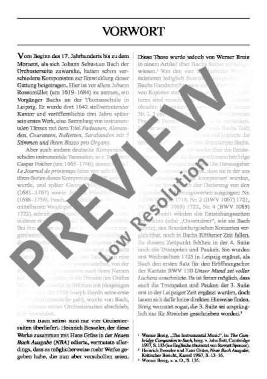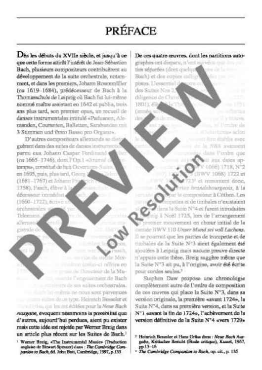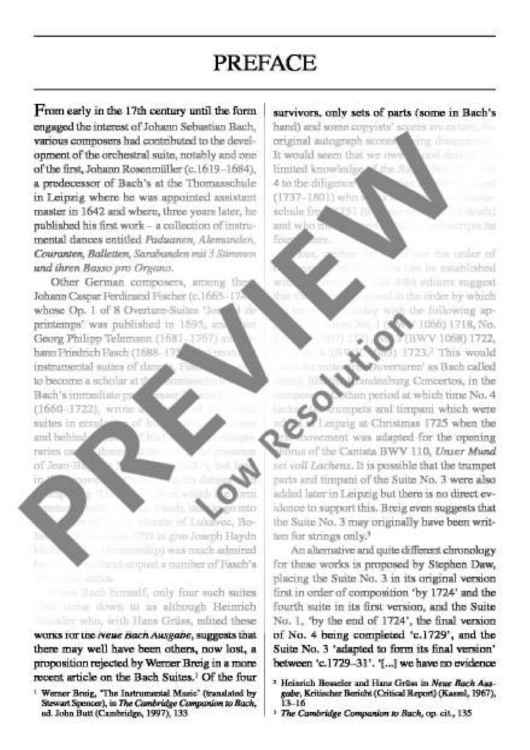 From early in the 17th century until the form engaged the interest of Johann Sebastian Bach, various notable German composers - including Rosenmüller, Fischer, Fasch and Telemann - had contributed to the development of the orchestral suite or 'Ouverture', whose name betrays its French theatrical origins. From Bach himself only four such suites have survived thanks to the diligence of C.F.Penzel, a student at the Thomasschule from 1751, who made copies of Bach's MSS which he found there. Thus, neither the dates nor the order of composition of the suites can be established with any certainty. As to the present suite in D major, recent criticism suggests that it may originally have been written for strings only, and dates, in its final form from around 1731. Penzel's copy of the suite includes significant variants to be played by a solo violin (marked Violino Concertato) which are included here in the Appendices. The score is newly-edited from the extant sources consisting of sets of parts (some in Bach's autograph) and copyist's scores are preserved in the Staastbibliothek zu Berlin - Preußischer Kulturbestitz, Musikabteilung mit Mendelssohn-Archiv. This edition replaces the former Eulenburg miniature score edited by Wilhelm Altmann.
