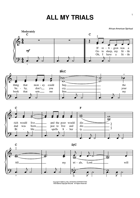 Digital Sheet Music for All My Trials by scored for Easy Piano; id:373822