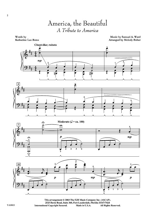 A lovely tribute to the United States, this poignant solo features moments of hope and great beauty. America, the Beautiful includes colorful harmonies, a singing right-hand melody, rubato playing, legato pedaling, a wide range of dynamics, and right-hand and left-hand octave playing.