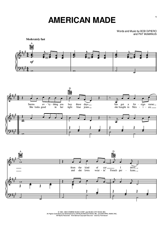Digital Sheet Music for American Made by Bob DiPiero, Pat McManus, The Oak Ridge Boys scored for Piano/Vocal/Chords; id:395441