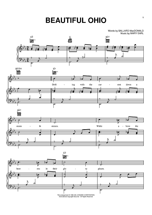 Digital Sheet Music for Beautiful Ohio by Chet Atkins, Glenn Miller, Ballard MacDonald, Mary Earl, Hank Snow scored for Piano/Vocal/Chords; id:368306