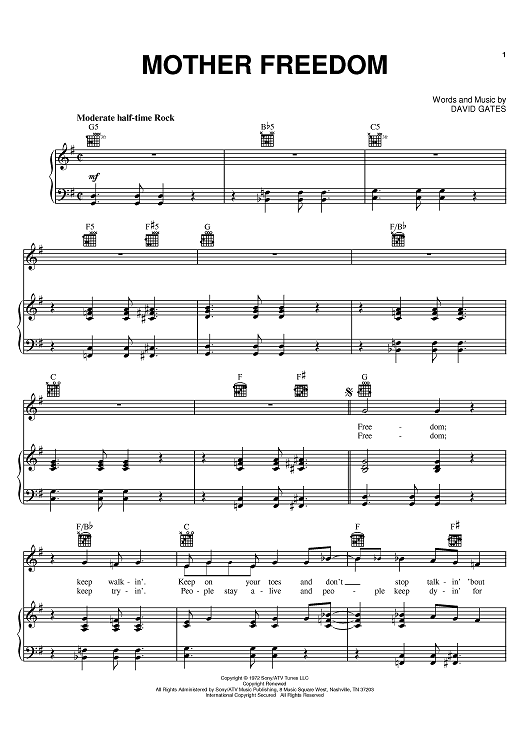Digital Sheet Music for Mother Freedom by Bread, David Gates scored for Piano/Vocal/Chords; id:388647