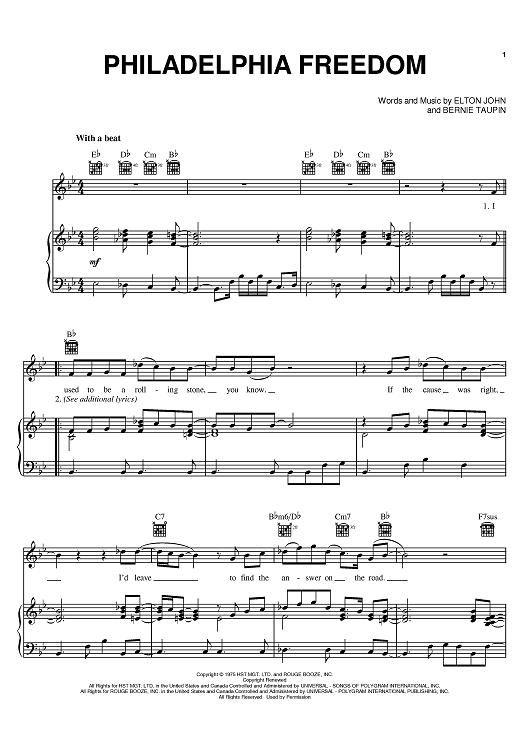 Digital Sheet Music for Philadelphia Freedom by Elton John, Bernie Taupin scored for Piano/Vocal/Chords; id:368219