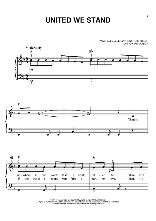 Digital Sheet Music for United We Stand by Brotherhood of Man, John Goodison, Anthony Toby Hiller scored for Easy Piano; id:367343