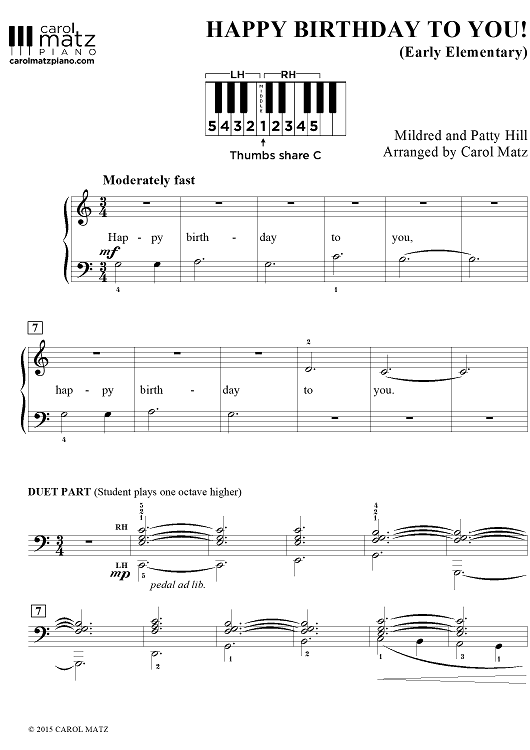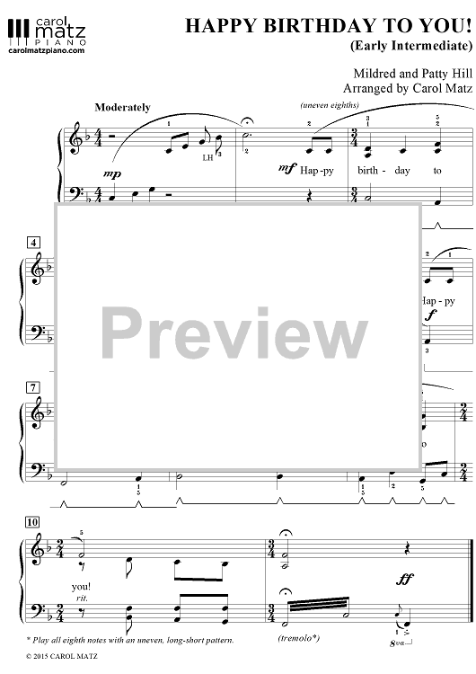 This packet includes 3 arrangements at different levels. The Early Elementary version is in Middle C position and includes an optional teacher duet part. Next is a Late Elementary version in G major, which includes eighth notes and connected pedal. And finally, the Early Intermediate arrangement contains thicker harmonies, chord inversions, and a tremolo.