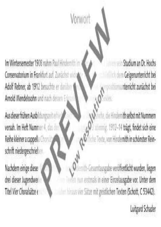 All settings are contrapuntal studies from Hindemith's own composition lessons of the years 1912-14. Notated in 'old clefs', these charming three-part miniatures for two female voices and one male voice have been difficult to access in the complete edition to date. Now, they finally provide access to general practical music-making due to their transcription in modern clefs and the addition of complete verse texts. Compositionally demanding, yet relatively easy-to-play pieces for concerts or even for liturgical purposes, which are ideal especially for small church choirs and choral societies.