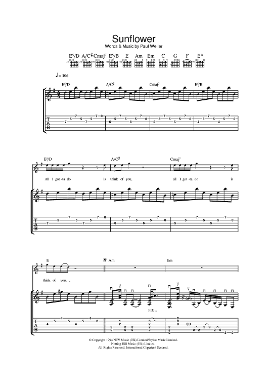 Digital Sheet Music for Sunflower by Paul Weller scored for Guitar Tab; id:396347