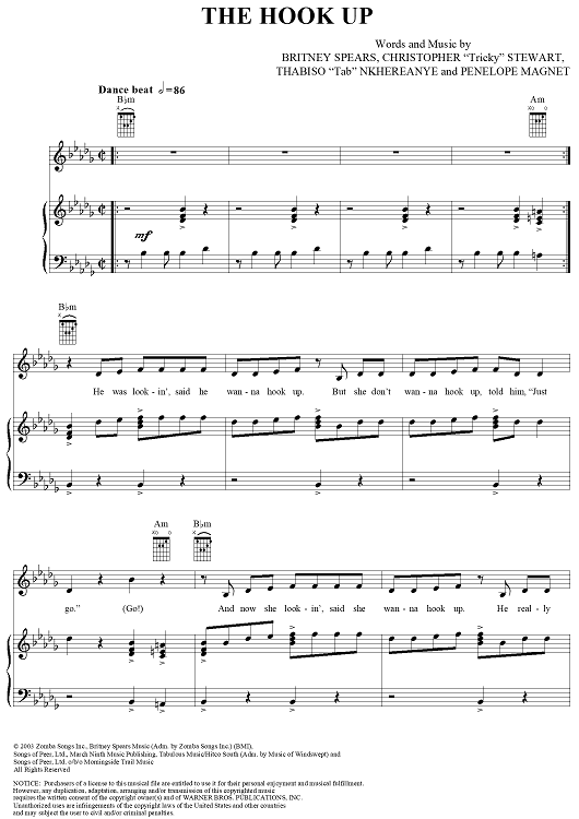 Digital Sheet Music for The Hook Up by Thabiso "Tab" Nkhereanye, Penelope Magnet, Tricky Stewart, Britney Spears scored for Piano/Vocal/Chords; id:311506