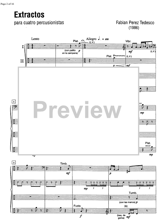 Digital Sheet Music for Extractos by Fabian Perez Tedesco scored for Percussion Quartet; id:333741