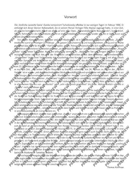 Tchaikovsky composed the Russian rural scene 'Dumka' in just a few days in late February 1886. 'Dumka' is originally the name of an epic and historical South West Slavic folk song of a melancholy nature. In Tchaikovsky's Op. 59, the elegiac andante cantabile forms the framework of the fast middle section in which brief formulaic thoughts, newly varied and increasing in virtuosic intensity, display fireworks of pianistic brilliance. Being his only 'Morceau de Concert', this piece occupies a special place among the piano works of Tchaikovsky. As a pianist who rarely gave concerts and occasionally complained about the lack of interest from the keyboard titans of his time (Franz Liszt, Hans von Bülow and the brothers Anton and Nikolaj Rubinstein) in his music. Tchaikovsky certainly regarded the piece as a chance to make his music known outside of Russia. So the French subtitle of the piece may rather be understood as a concession to the French audience.