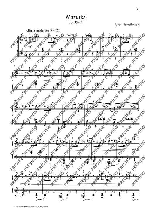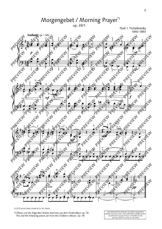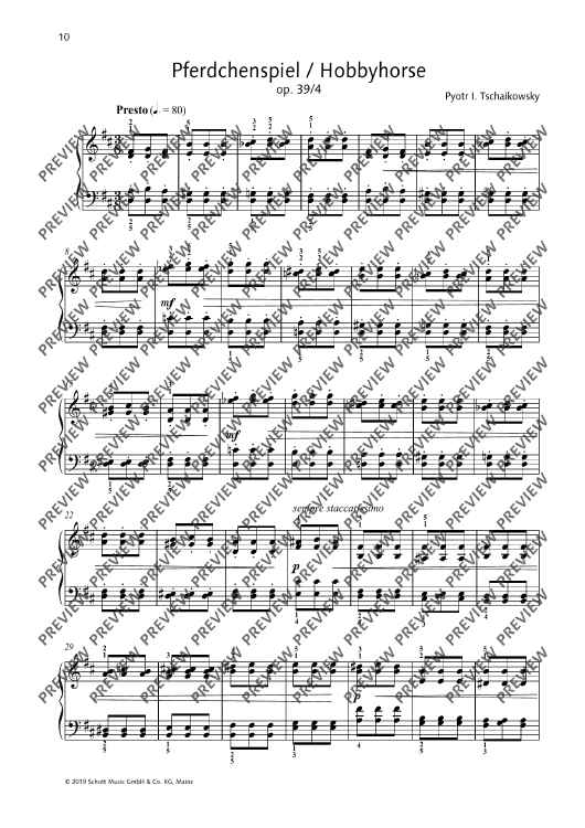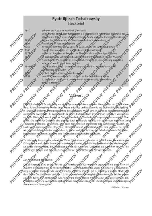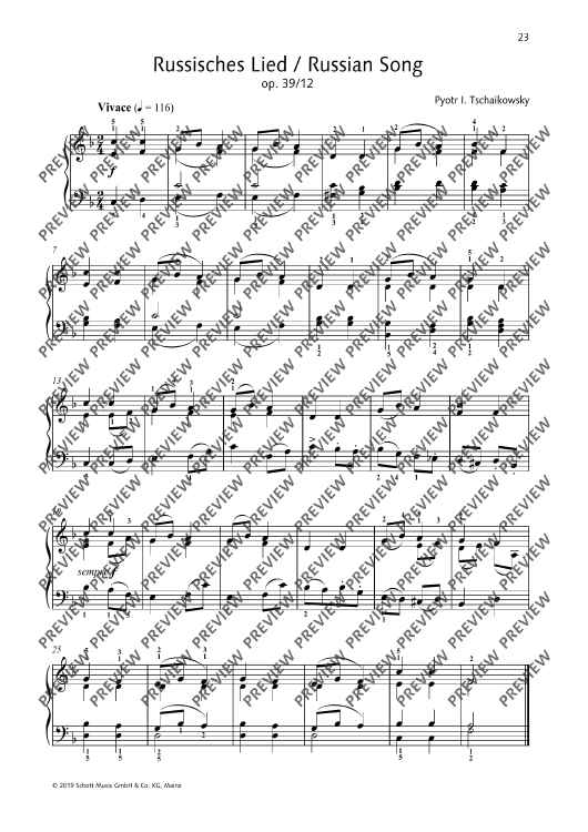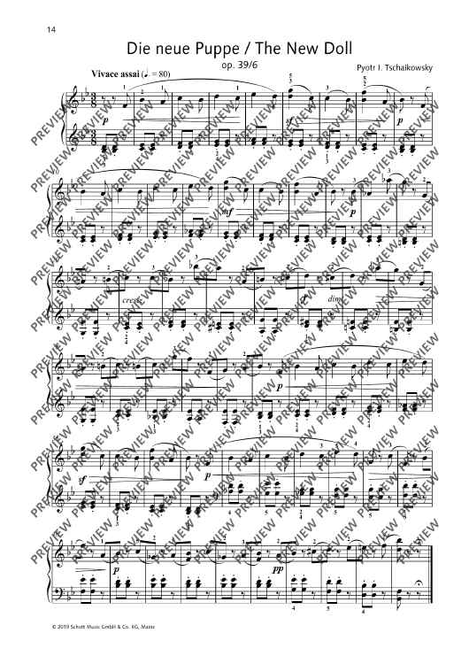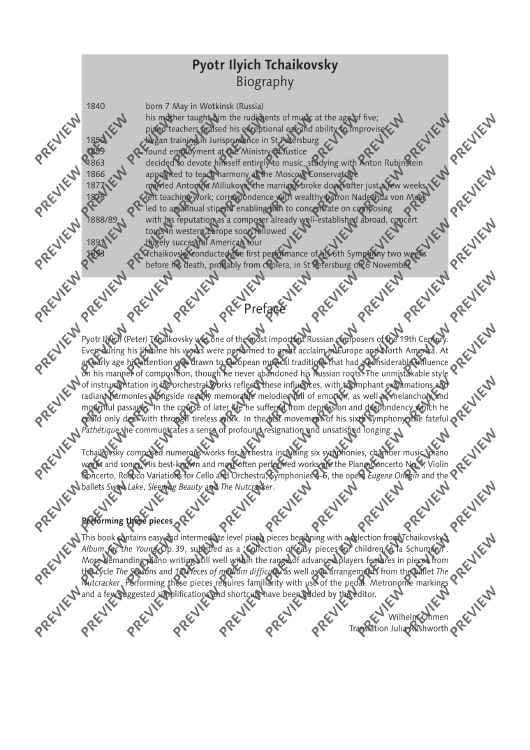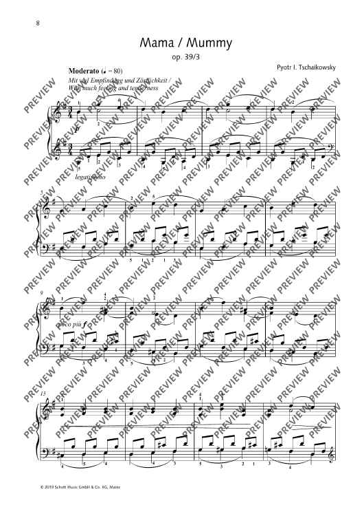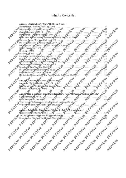 "My First Tchaikovsky" contains easy and intermediate level piano pieces beginning with a selection from the "Album for the Young" Op. 39. The pieces from the cycle "The Seasons" and "12 Pieces of medium difficulty" as well as the arrangements from the ballet "The Nutcracker" with their more demanding piano writing are easy to master by advanced players. Ideal for teaching and playing at home. Great works for little masters!