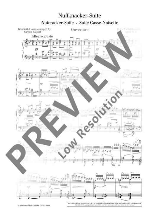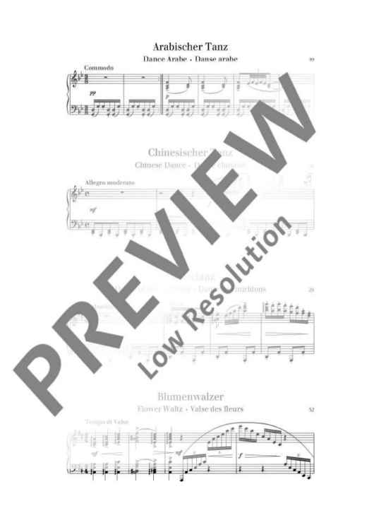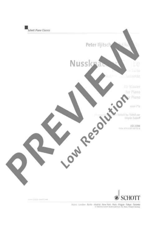 The Nutcracker Suite is a piano arrangement of the concert version of the ballet of that name. Tchaikovsky used only part of the music for the ballet in the suite. The Overture and the March, which is the most important of the characteristic dances in the Suite, come from the first act of the ballet. The remaining dances originate from the second act. They are: The Dance of the Sugar Plum Fairy, in which the leading part is, in the original composition, played typically by the celeste almost all the way through; the fiery Russian "Trepak" which reminds us of Tchaikovsky's national origins; the Arab Dance tinged with a gentle melancholy; the Chinese Dance with its ostinato triple rhythm; the graceful Dance of the Reed Flutes; and finally the longest piece in the Suite: the Waltz of the Flowers in which Tchaikovsky, writing in the penultimate year of his life, showed his musical affinity with Johann Strauss.The Nutcracker Suite was performed for the first time, with great success, on 7 March 1892 at the Ninth Symphony Concert of the Russian Musical Society in St Petersburg.