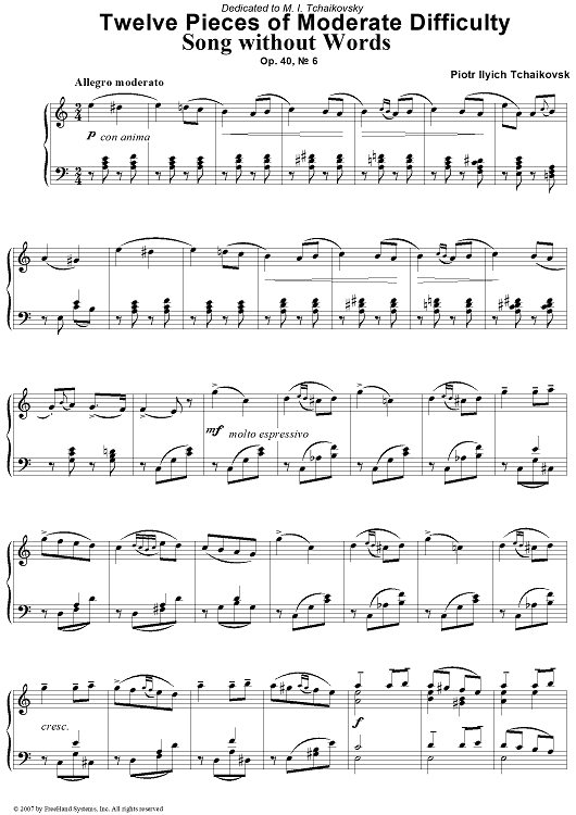 "Twelve Pieces of Moderate Difficulty. No. 6. Song without Words" Sheet Music by Peter Ilyich Tchaikovsky