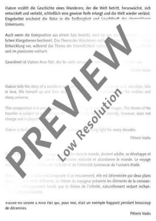 "Viatore" was originally one of Peteris Vasks's extremely successful works for string orchestra. This newly-published arrangement translates the inexorably shimmering original string sound of the piece into a sonorous organ sound foundation. In the adaptation for organ, the catchy motif of "Viatore" (Passenger) receives entirely new dynamic possibilities. The whole sound potential of the "queen" of instruments is fully explored, the typical "Vasks sound" is maintained and at the same time expanded by new, surprising aspects.
