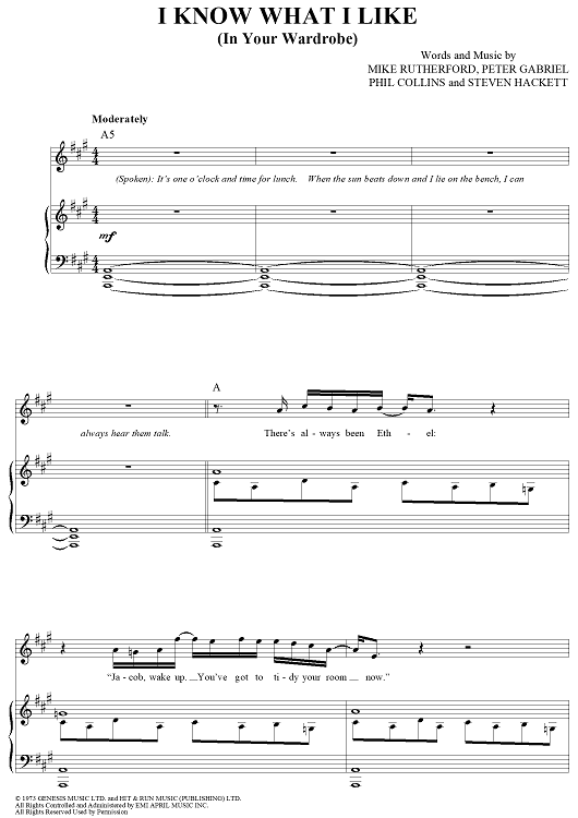 Digital Sheet Music for I Know What I Like (In Your Wardrobe) by Genesis, Mike Rutherford, Steve Hackett, Phil Collins, Peter Gabriel scored for Piano/Vocal/Chords; id:411452