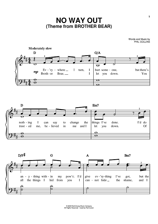 Digital Sheet Music for No Way Out (Theme From BROTHER BEAR) by Phil Collins scored for Easy Piano; id:373916