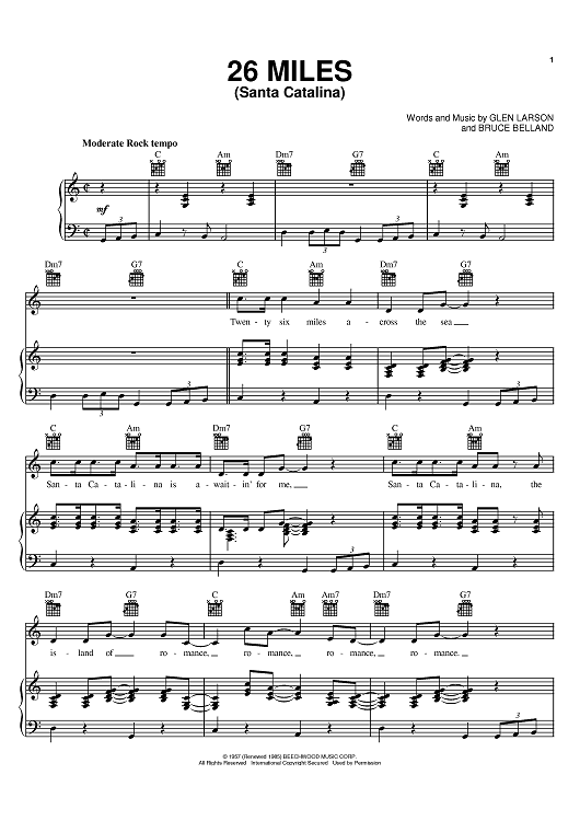 Digital Sheet Music for 26 Miles (Santa Catalina) by Glen Larson, Bruce Belland, The Four Preps scored for Piano/Vocal/Chords; id:368788