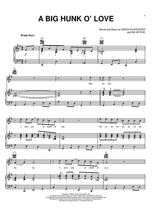 Digital Sheet Music for A Big Hunk O' Love by Elvis Presley, Aaron Schroeder, Sid Wyche scored for Piano/Vocal/Chords; id:368695