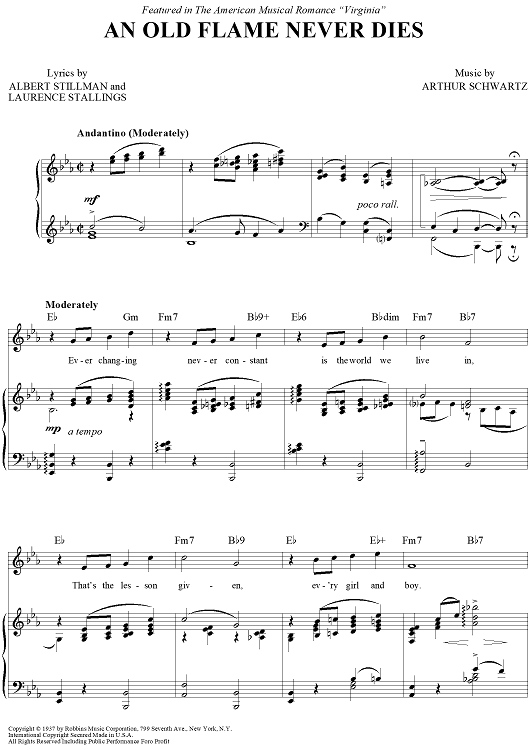 Digital Sheet Music for An Old Flame Never Dies by Arthur Schwartz, Albert Stillman, Laurence Stallings scored for Piano/Vocal; id:419196