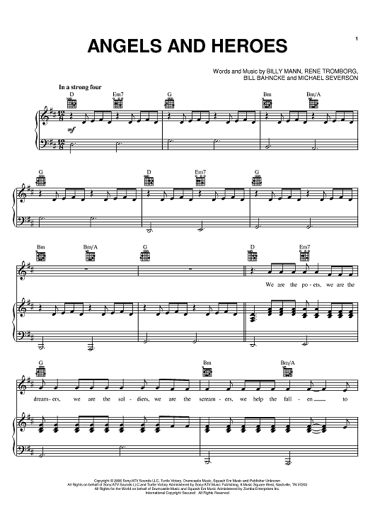 Digital Sheet Music for Angels And Heroes by Billy Mann, Brian Littrell, Bill Bahncke, Michael Severson, Rene Tromberg scored for Piano/Vocal/Chords; id:393571