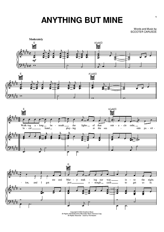 Digital Sheet Music for Anything But Mine by Kenny Chesney, Scooter Carusoe scored for Piano/Vocal/Chords; id:374487