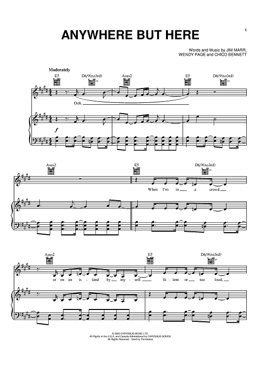 Digital Sheet Music for Anywhere But Here by Chico Bennett, Jim Marr, Wendy Page, Hilary Duff scored for Piano/Vocal/Chords; id:373570
