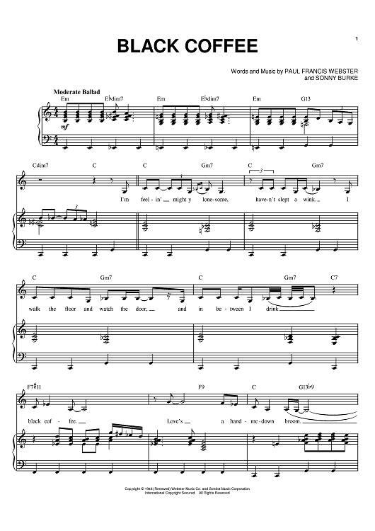 Digital Sheet Music for Black Coffee by Sarah Vaughan, Ella Fitzgerald, Paul Francis Webster, Sonny Burke, Peggy Lee, Julie London scored for Piano/Vocal/Chords; id:375443