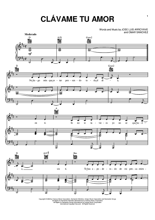 Digital Sheet Music for Clavame Tu Amor by Jose Luis Arroyave, Omar Sanchez scored for Piano/Vocal/Chords; id:372944