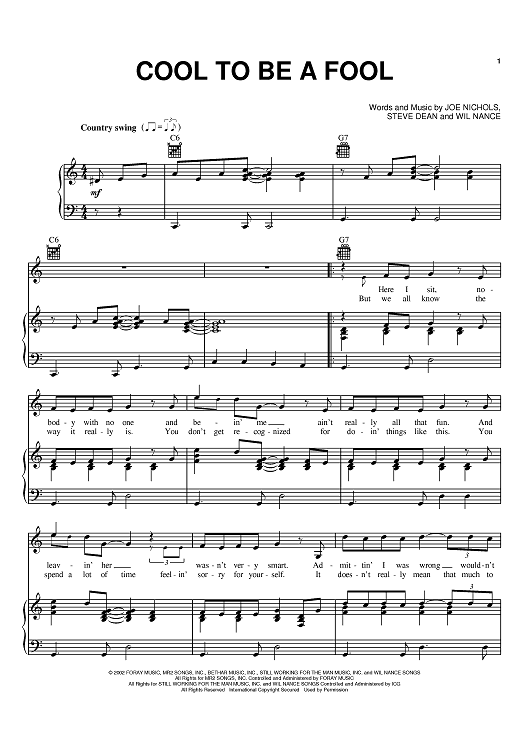Digital Sheet Music for Cool To Be A Fool by Steve Dean, Wil Nance, Joe Nichols scored for Piano/Vocal/Chords; id:373702