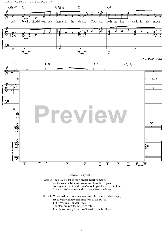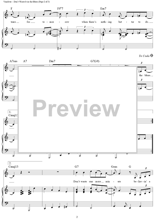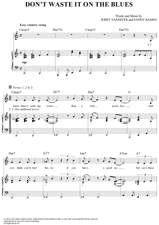 Digital Sheet Music for Don't Waste It on the Blues by Gene Watson, Sandy Ramos, Jerry Vandiver scored for Piano/Vocal/Chords; id:362734