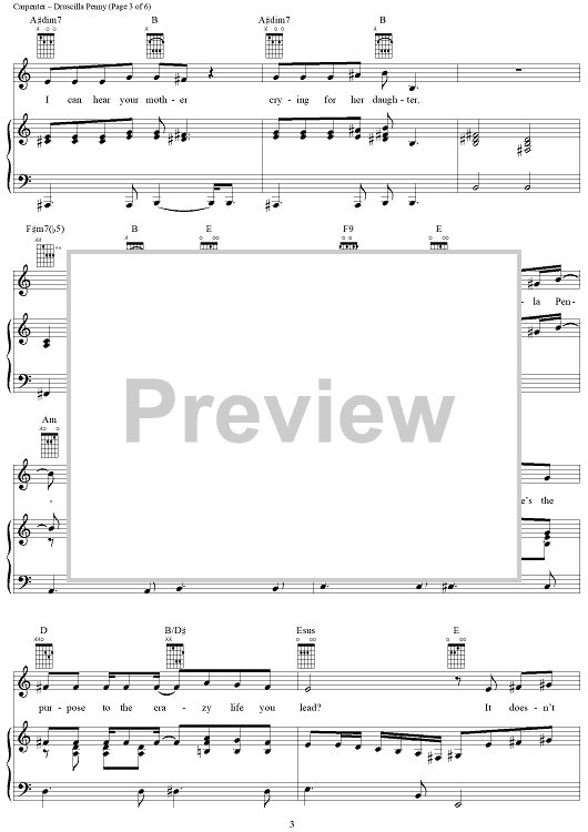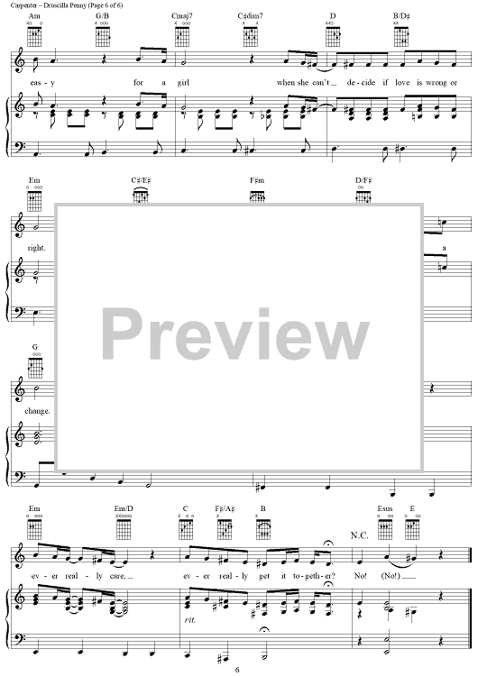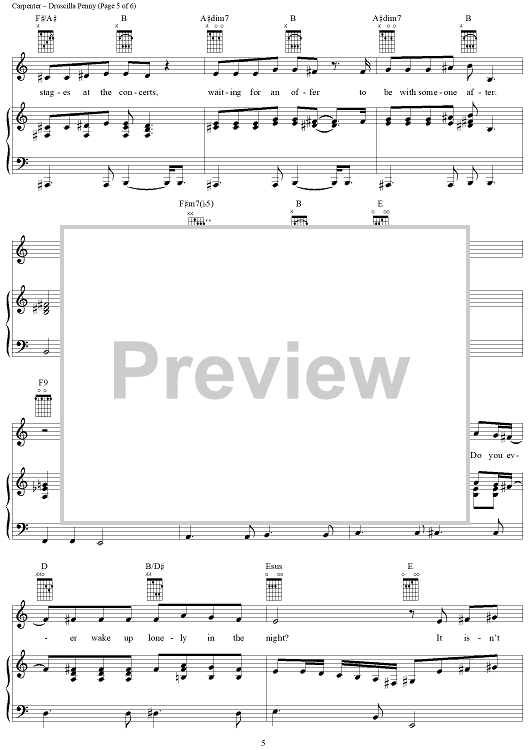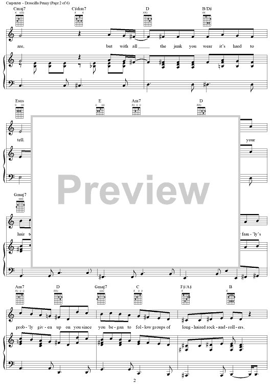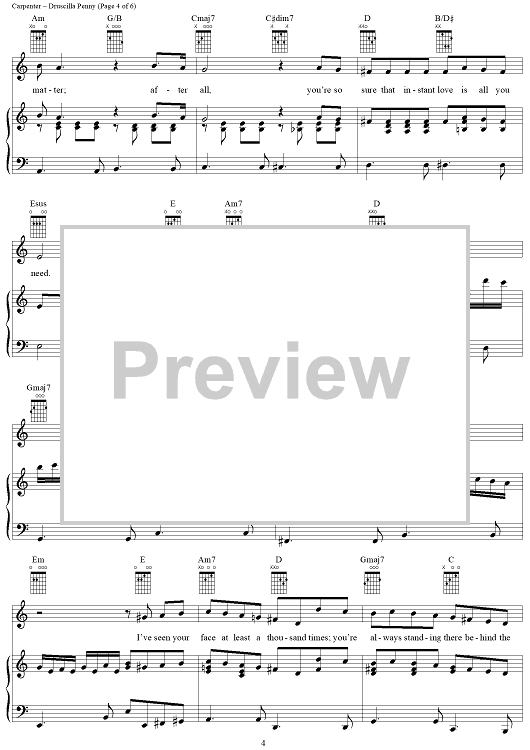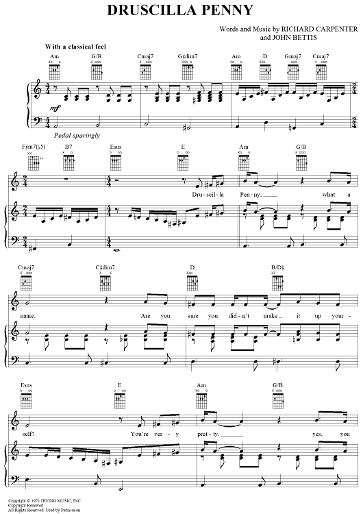 Digital Sheet Music for Druscilla Penny by The Carpenters, Richard Carpenter, John Bettis scored for Piano/Vocal/Chords; id:367261