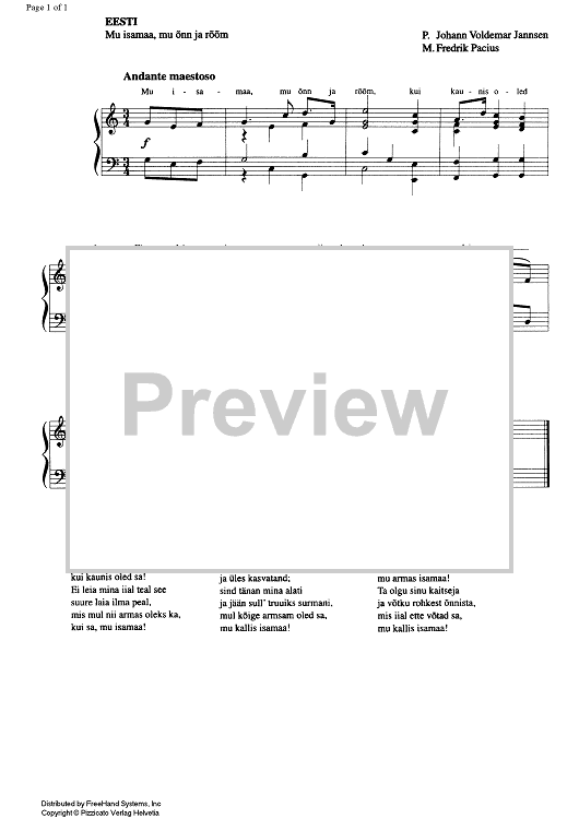 "Estonia - Mu isamaa, mu onn ja room" Sheet Music by Frederik Pacius