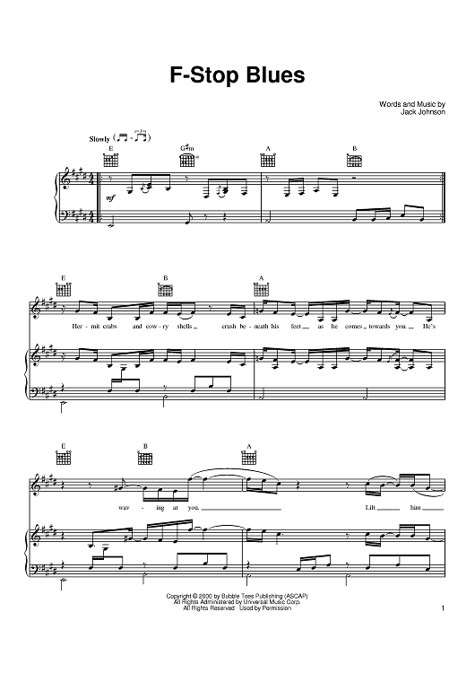 Digital Sheet Music for F-Stop Blues by Jack Johnson scored for Piano/Vocal/Chords; id:389773