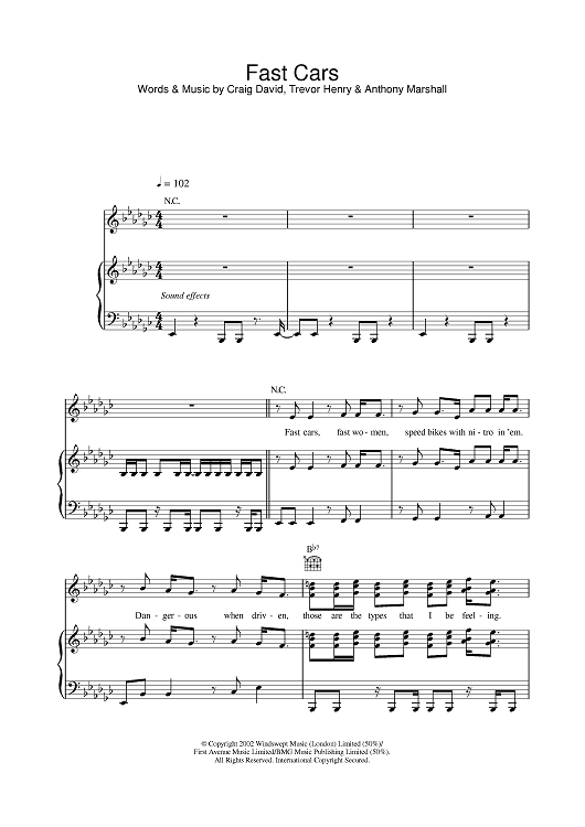 Digital Sheet Music for Fast Cars by Craig David, Trevor Henry, Anthony Marshall scored for Piano/Vocal/Chords; id:377891