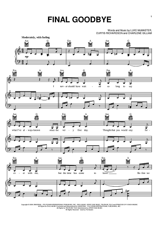 Digital Sheet Music for Final Goodbye by Rihanna, Charlene Gilliam, Luke McMaster, Curtis Richardson scored for Piano/Vocal/Chords; id:393367