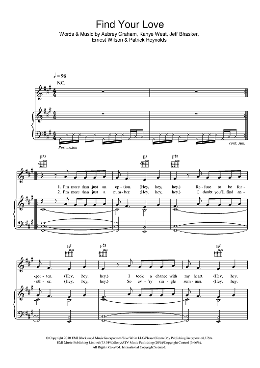 Digital Sheet Music for Find Your Love by Kanye West, Drake, Aubrey Graham, Jeff Bhasker, Ernest Wilson, Patrick Reynolds scored for Piano/Vocal/Chords; id:414918