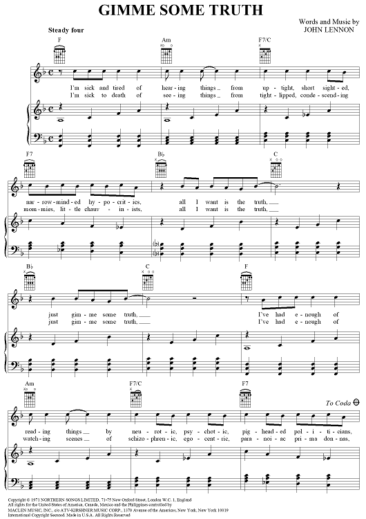 Digital Sheet Music for Gimme Some Truth by John Lennon scored for Piano/Vocal/Chords; id:365297